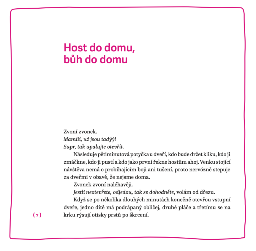 Přes rok jsem posílala odběratelům Vět(v)ičky – glosy psané jazykem mého kmene. Dávku humoru pro povinnostmi zasekané rodiče. Jednou měsíčně krátké čtení přímo na e-mail. Žádná velká jedliteratura, zato nadhled a sebeironie v situacích, co životu nasazují korunu. Tím jsem si na sebe ušila lehký bič, abych i v časech největšího nestíhání a pracovního zápřahu musela alespoň jednou měsíčně vyplodit něco, co se nebudu stydět dát přečíst více než sedmi stům lidem. Záměrně říkám alespoň. Snažila jsem se totiž psát víc. Jak jen to šlo. A po roce jsem dala dohromady 22 fejetonů popisujících s ironií a nadsázkou situace rodičovské každodennosti. Okamžiky, v nichž realita často přejede iluze jak parní válec. Třeba se v nich najdete, snad vás pobaví nebo aspoň uklidní, že je to všude podobné.